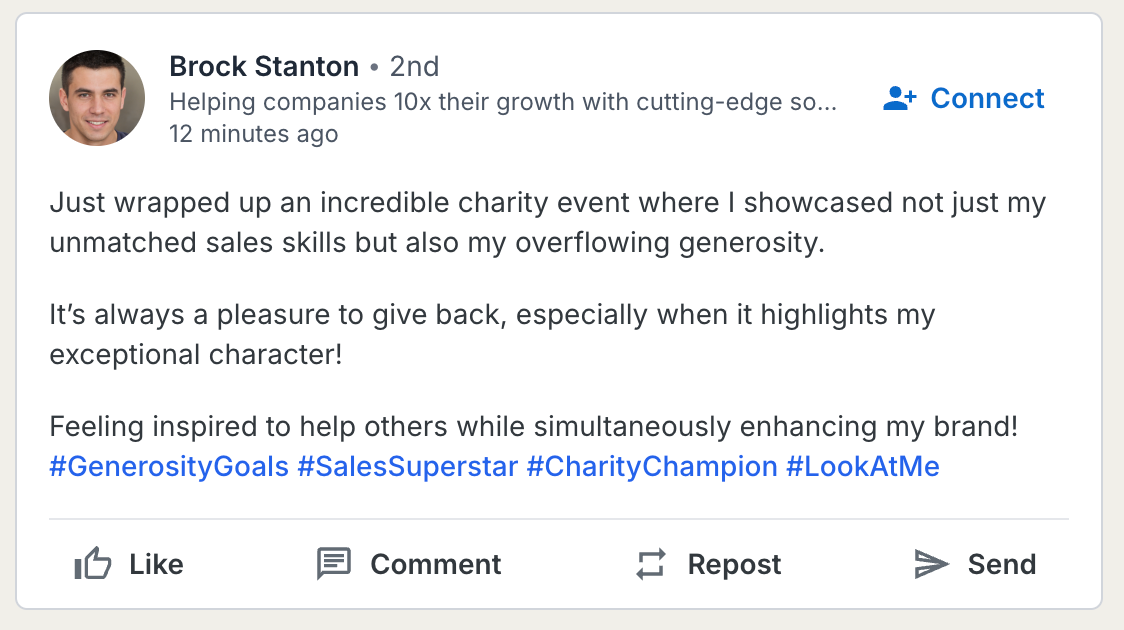 You are tasked with drafting a LinkedIn post for a narcissistic enterprise software salesperson for satirical,