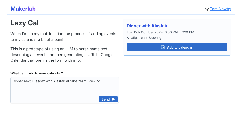 Lazy Cal is a simple prototype that uses gpt-4o-mini to convert natural language into a calendar event schema. From this it then generates a URL that links into Google Calendar with some details prefilled.